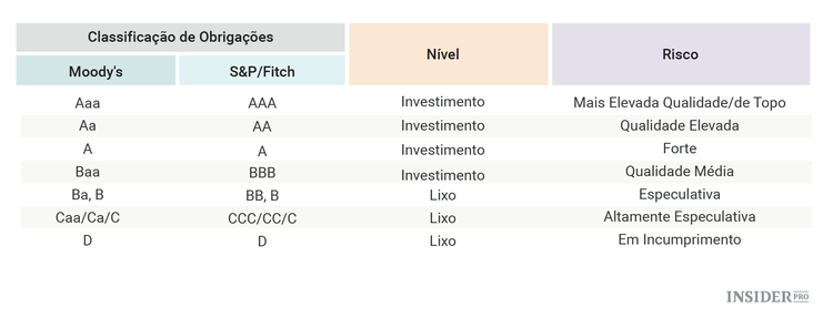 O sistema de classificação (rating) de risco ajuda os investidores a determinarem o risco de crédito de uma empresa. Pense na classificação de obrigações como um relatório da classificação de crédito da empresa. As empresas mais respeitadas, que representam investimentos mais seguros, têm uma classificação superior, enquanto as empresas mais arriscadas têm uma classificação inferior. O gráfico que se segue ilustra a diferença entre as escalas de classificação das principais agências de classificação (rating) dos EUA: Moody’s, Standard & Poor’s e Fitch Ratings.