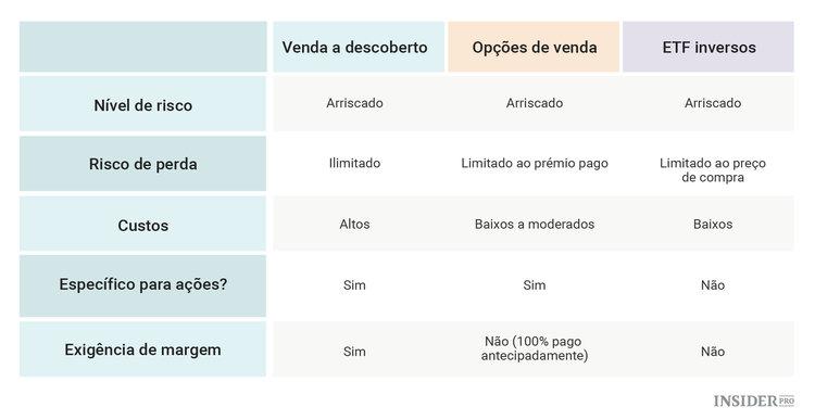Os investidores que desejem agir com uma visão pessimista em relação às ações, setores ou ao mercado em geral, têm um par de alternativas à venda a descoberto: as opções de venda (put options) e os fundos transacionados em bolsa (ETF) inversos.