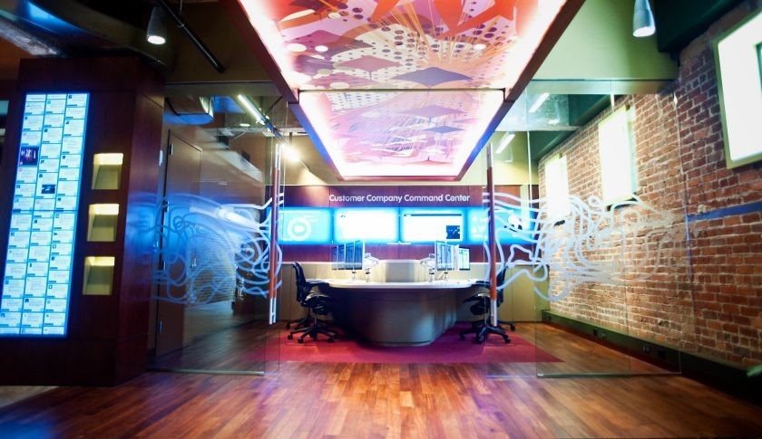 Os elegantes e modernos escritórios da sede da Salesforce em São Francisco contam com paredes de vidro e grandes ecrãs.